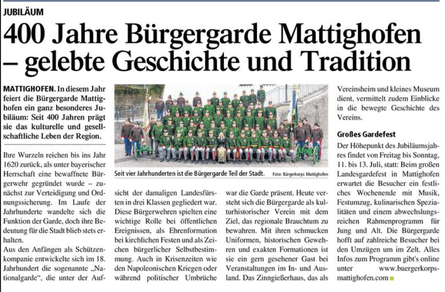400 Jahre Bürgergarde Mattighofen – gelebte Geschichte und Tradition 9. Juli 2025Allgemein, PresseSimone Redemann Tips 09.07.2025