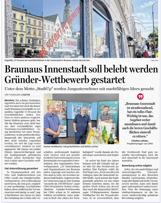 Braunaus Innenstadt soll belebt werden Gründer-Wettbewerb gestartet 21. Juni 2025Allgemein, PresseSimone Redemann OÖ Nachrichten 21.06.2025