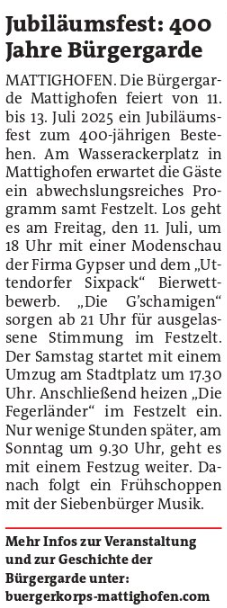 Jubiläumsfest: 400 Jahre Bürgergarde 3. Juli 2025Allgemein, PresseSimone Redemann BezirksRundSchau 03.07.2025